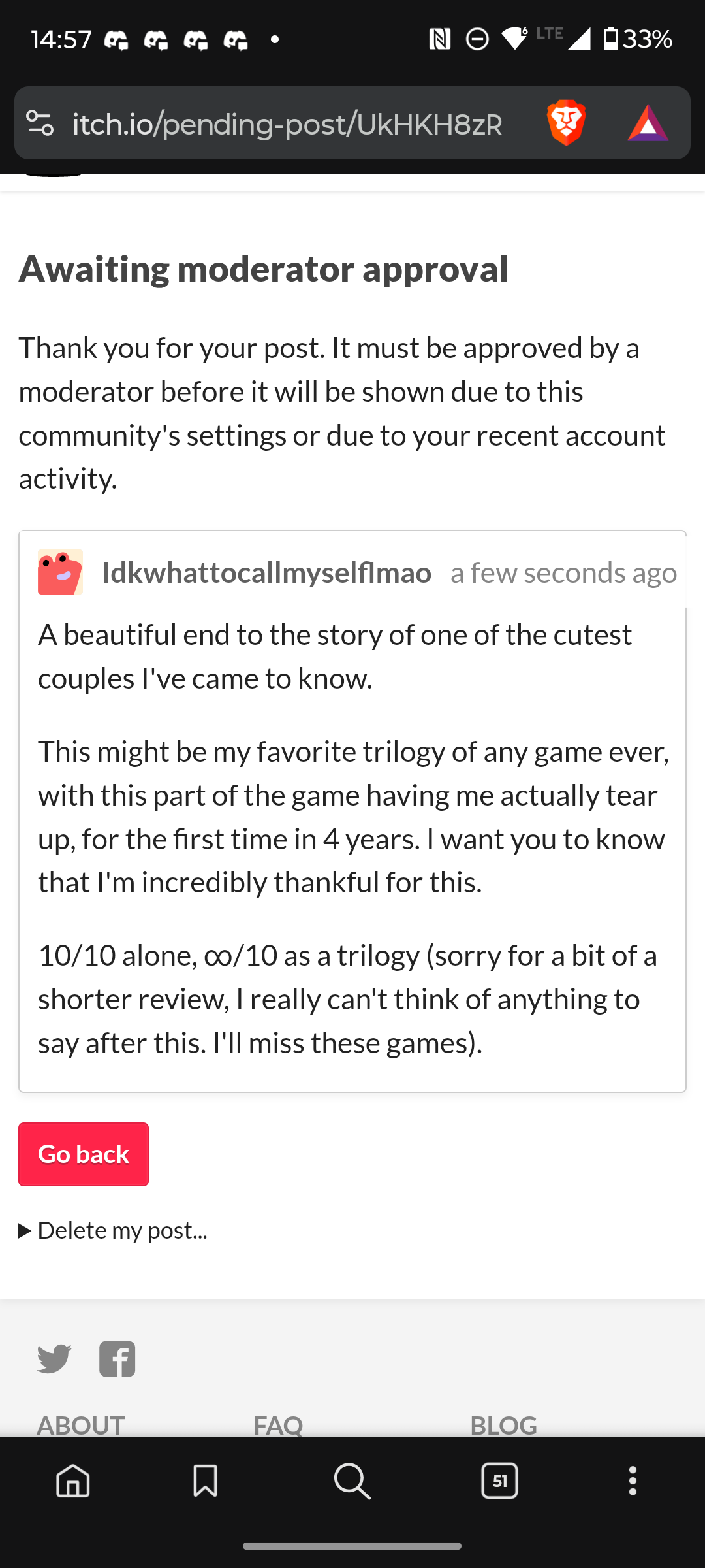 I finally got around to playing this and, oh my god, this blew me away!! I really wasn't expecting to enjoy it as much as I did. Your writing has improved so much from your previous games. This is now my favorite visual novel of yours.