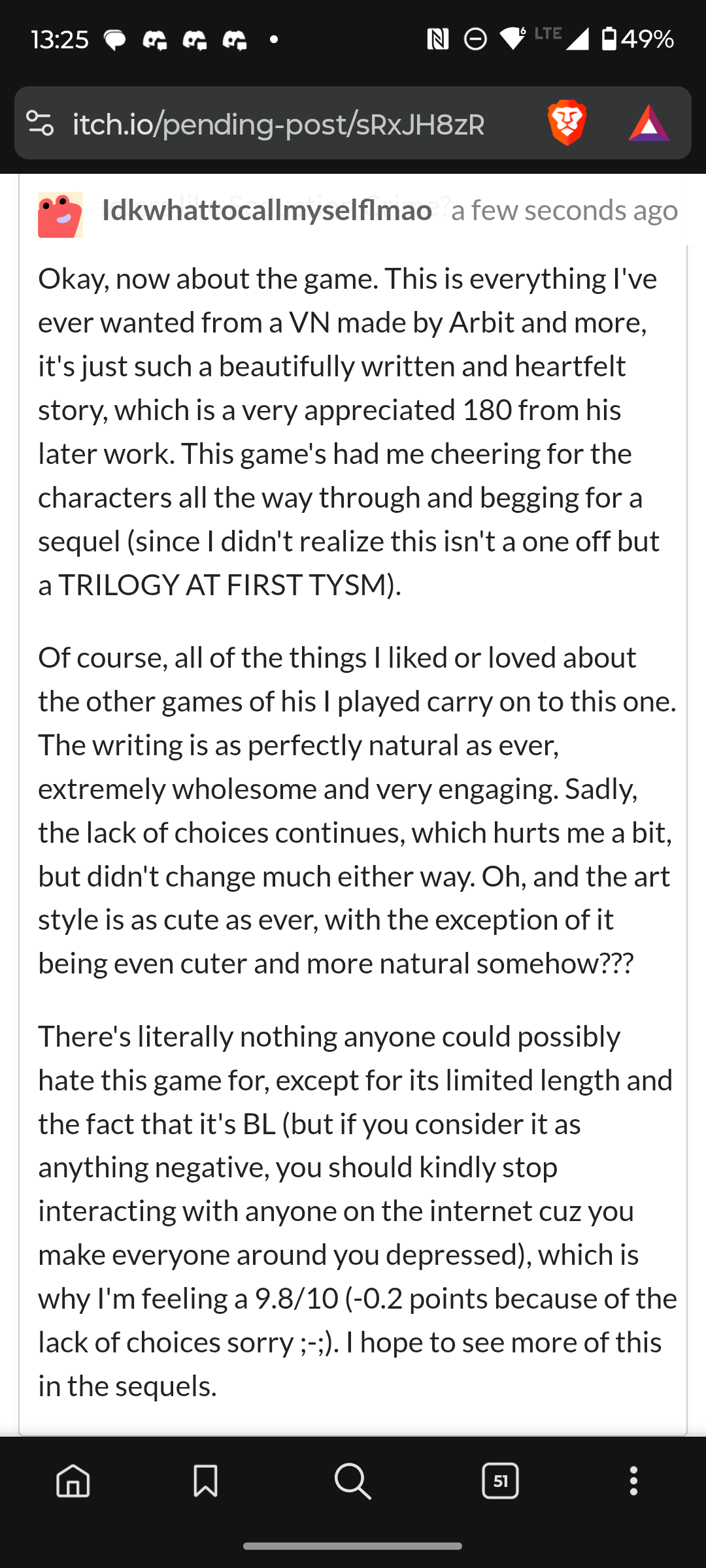 Of course, all of the things I liked or loved about the other games of his I played carry on to this one. The writing is as perfectly natural as ever, extremely wholesome and very engaging. Sadly, the lack of choices continues, which hurts me a bit, but didn't change much either way. Oh, and the art style is as cute as ever, with the exception of it being even cuter and more natural somehow???