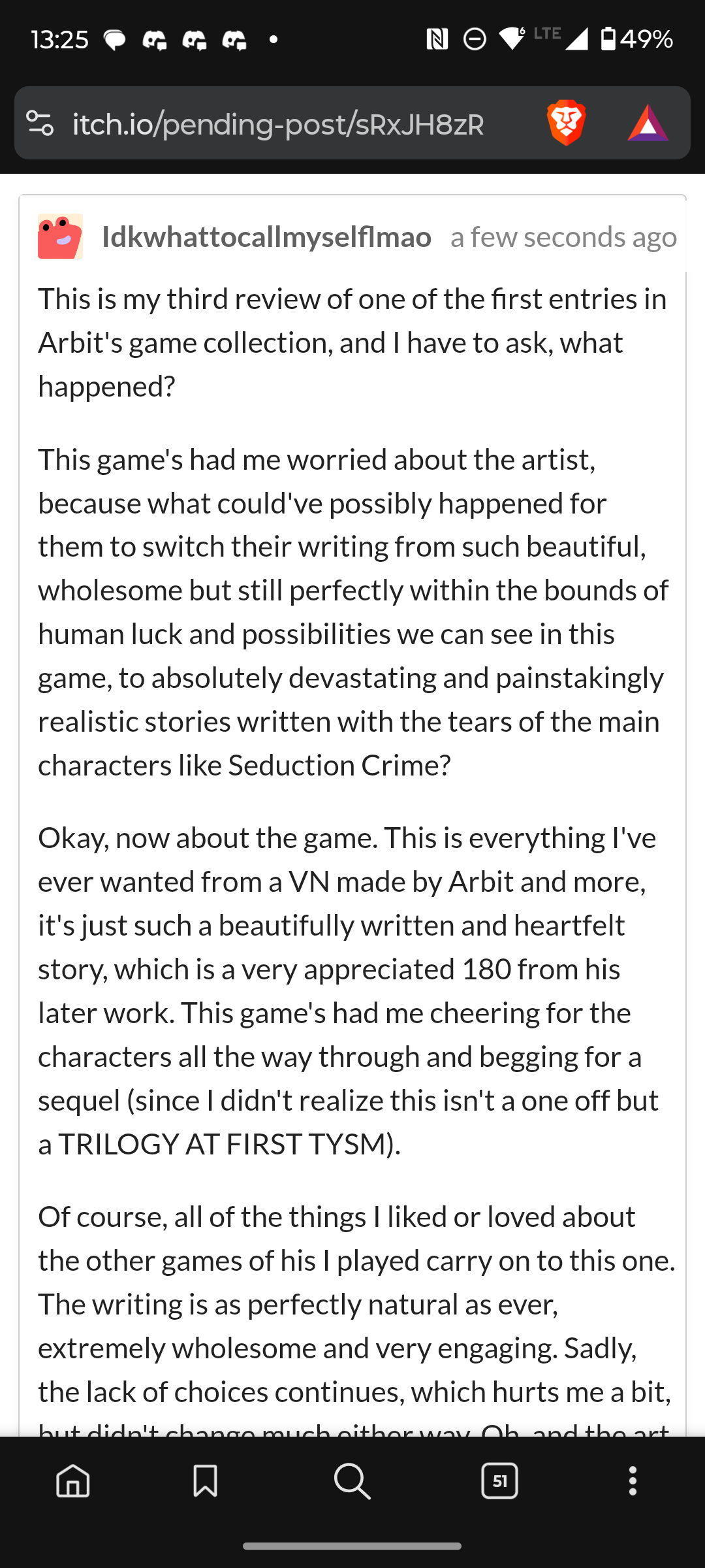 Okay, now about the game. This is everything I've ever wanted from a VN made by Arbit and more, it's just such a beautifully written and heartfelt story, which is a very appreciated 180 from his later work. This game's had me cheering for the characters all the way through and begging for a sequel (since I didn't realize this isn't a one off but a TRILOGY AT FIRST TYSM).