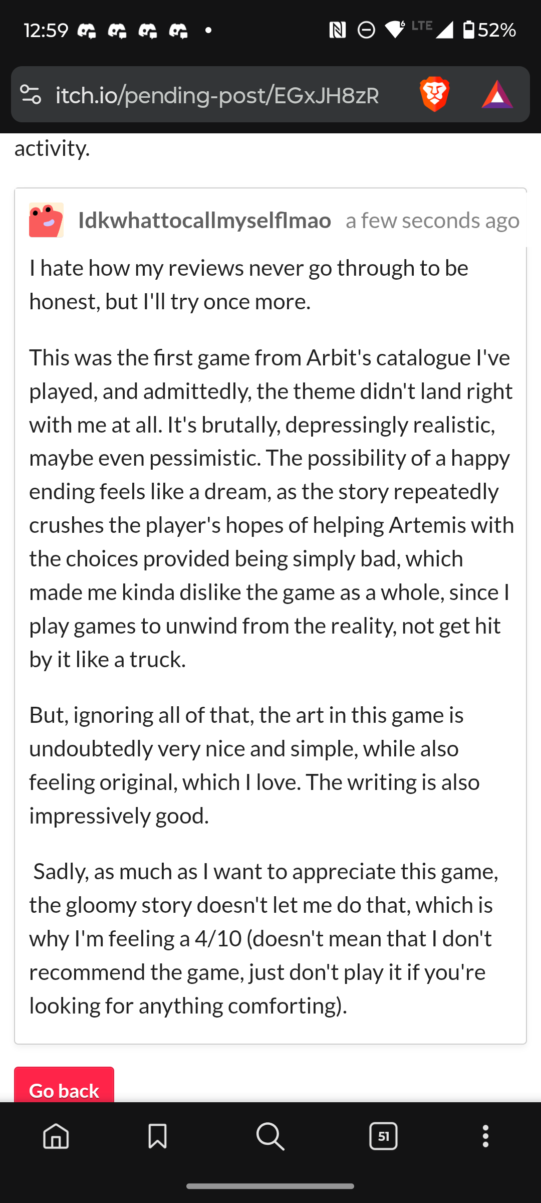 This was the first game from Arbit's catalogue I've played, and admittedly, the theme didn't land right with me at all. It's brutally, depressingly realistic, maybe even pessimistic. The possibility of a happy ending feels like a dream, as the story repeatedly crushes the player's hopes of helping Artemis with the choices provided being simply bad, which made me kinda dislike the game as a whole, since I play games to unwind from the reality, not get hit by it like a truck.